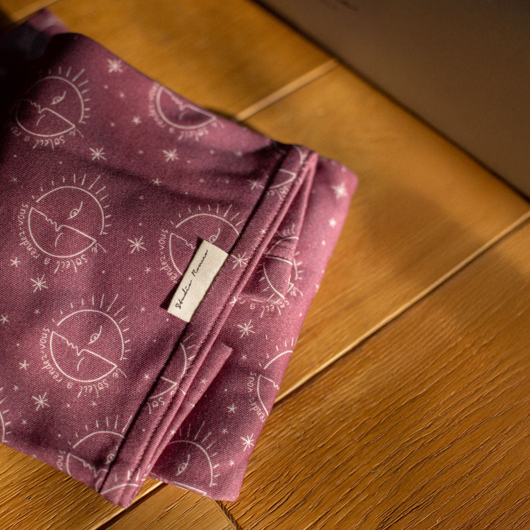 Son motif exclusif Céleste — un jeu délicat de soleils, lunes et étoiles dessinés à la main — se déploie sur un fond prune profond, évoquant la sérénité des nuits étoilées. Une création pensée pour les parents qui aiment porter leur bébé dans un univers empreint de magie.